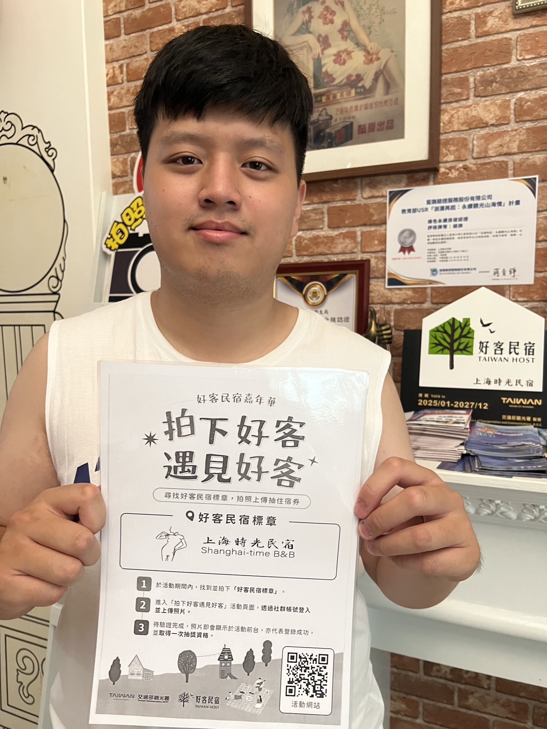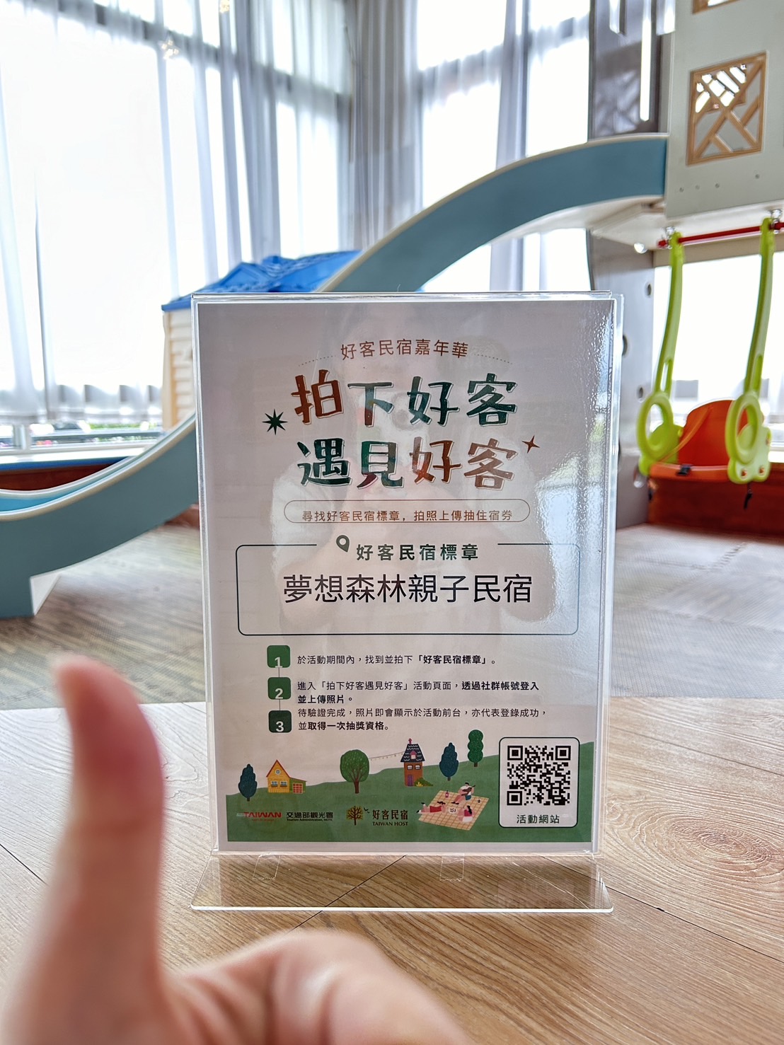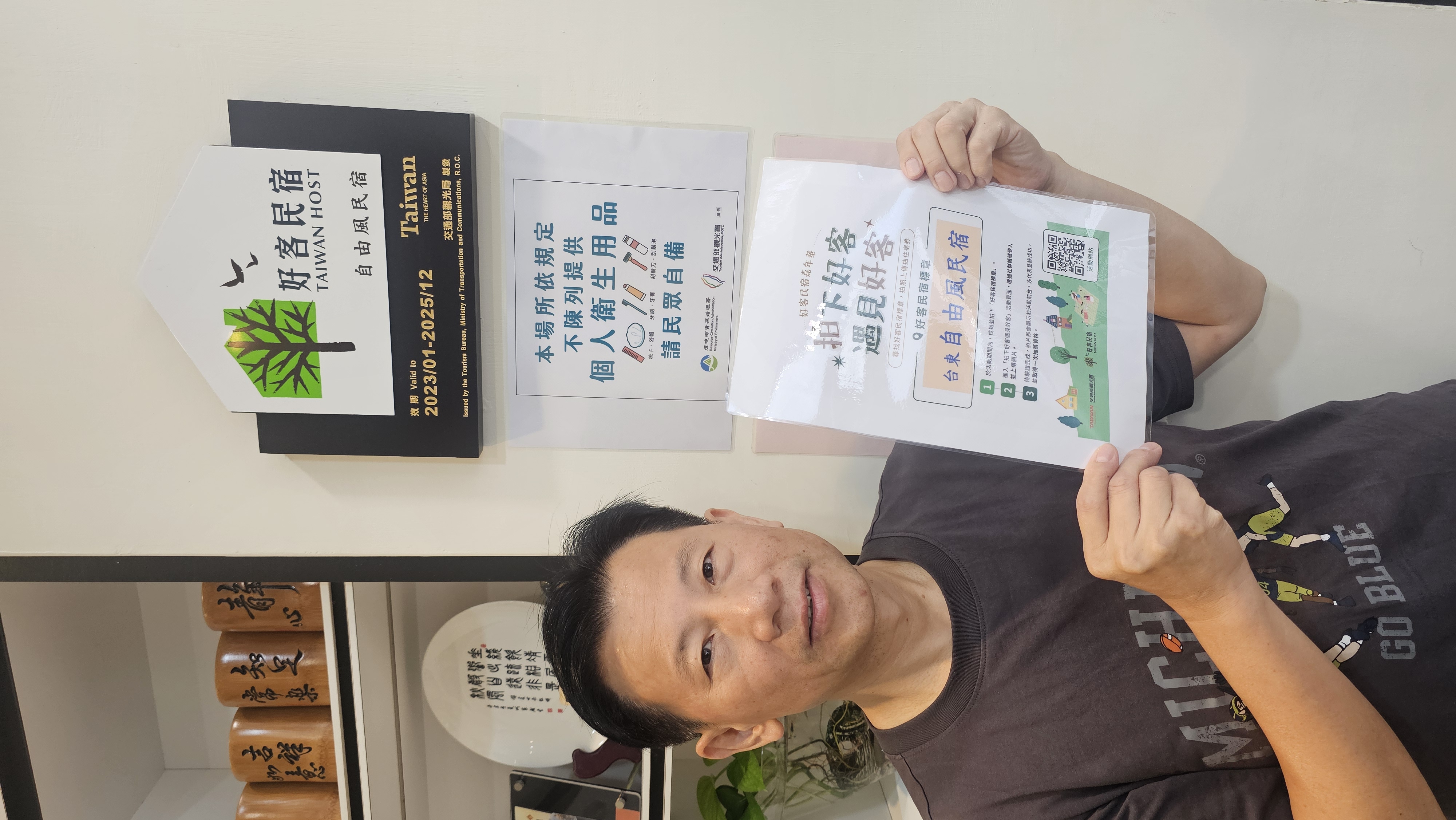 *請注意,照片中必須清楚拍攝到「好客民宿標章」或「好客民宿打卡牌及民宿招牌」,皆須同時包含「本人」入鏡。【好客民宿標章】